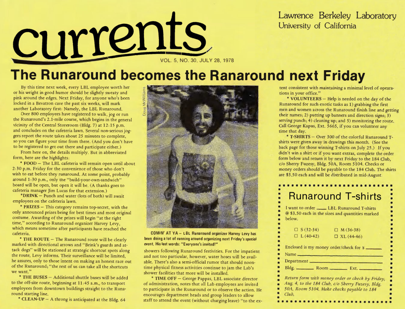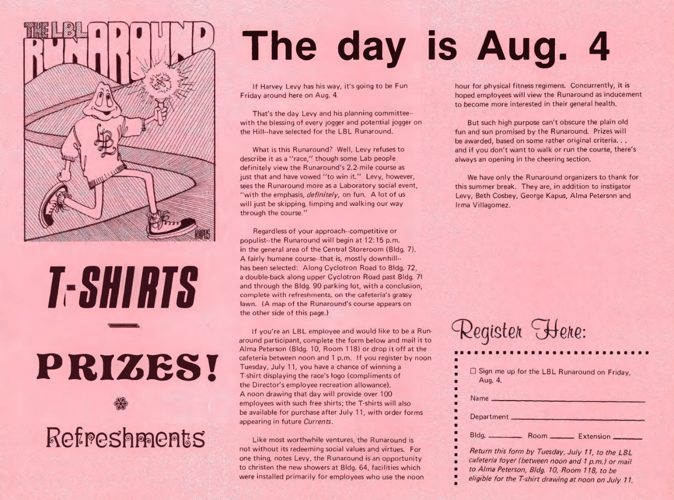 The first mascot was not a goat or turkey, but a frog in running shoes carrying a torch. Lab employees were encouraged to register via a paper form and were promised refreshments and prizes.